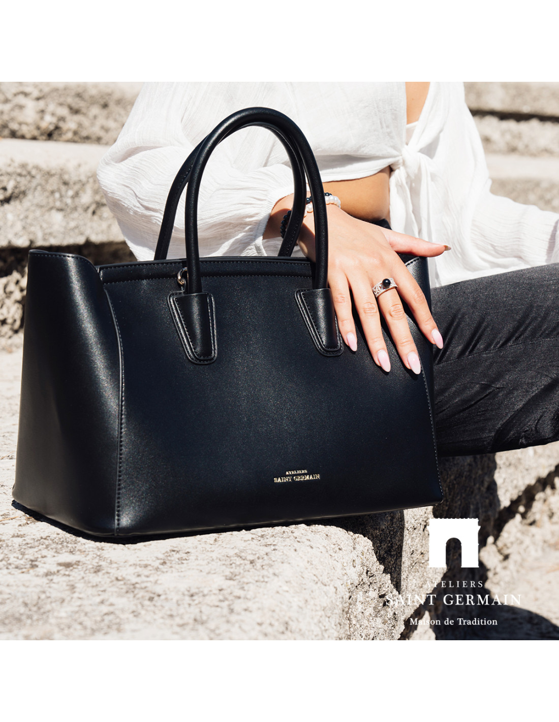 Sac Cabas Fourre-tout LEVALLOIS - Pochette intérieure - Bijou Poignée Décoratif - Bandoulière ajustable et amovible disponible - Logo ATELIERS SAINT GERMAIN - Finition Cuir pleine Fleur