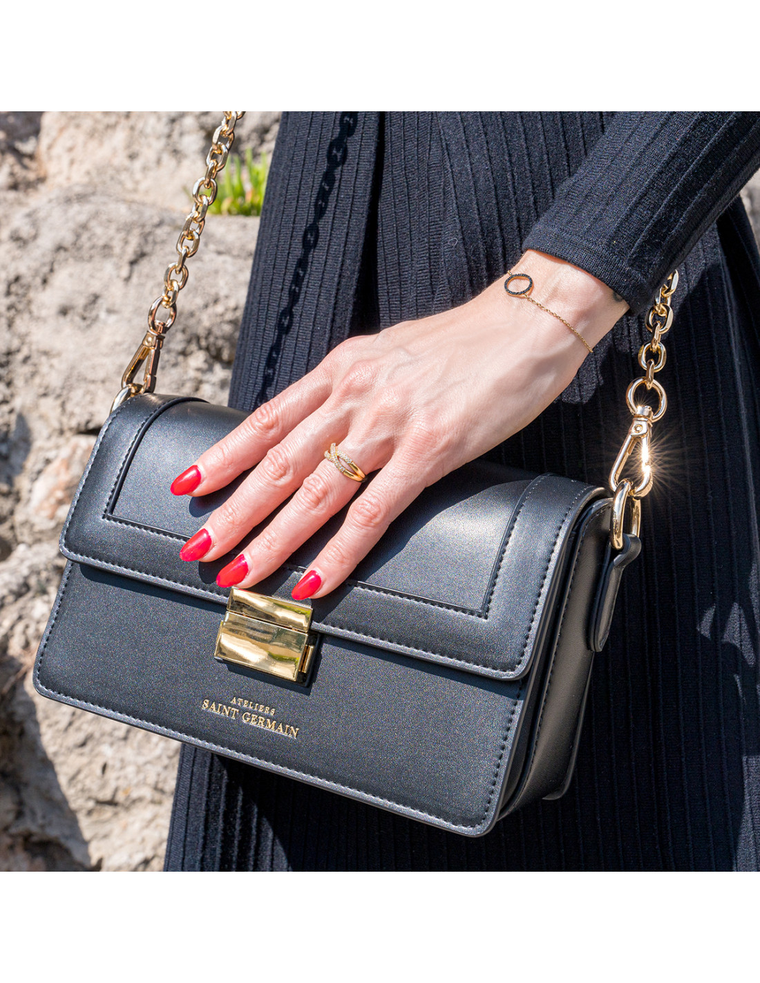 Sac Baguette SAINT CLOUD Porté Épaule - 2 Compartiment dont 1 Zippé - Pochette intérieure Zippée - Bandoulière Amovible Chainage doré avec Cuir épaule - Logo ATELIERS SAINT GERMAIN - Fermeture à Rabat avec Fermoir à Cliquet Doré - Finition Cuir pleine Fleur