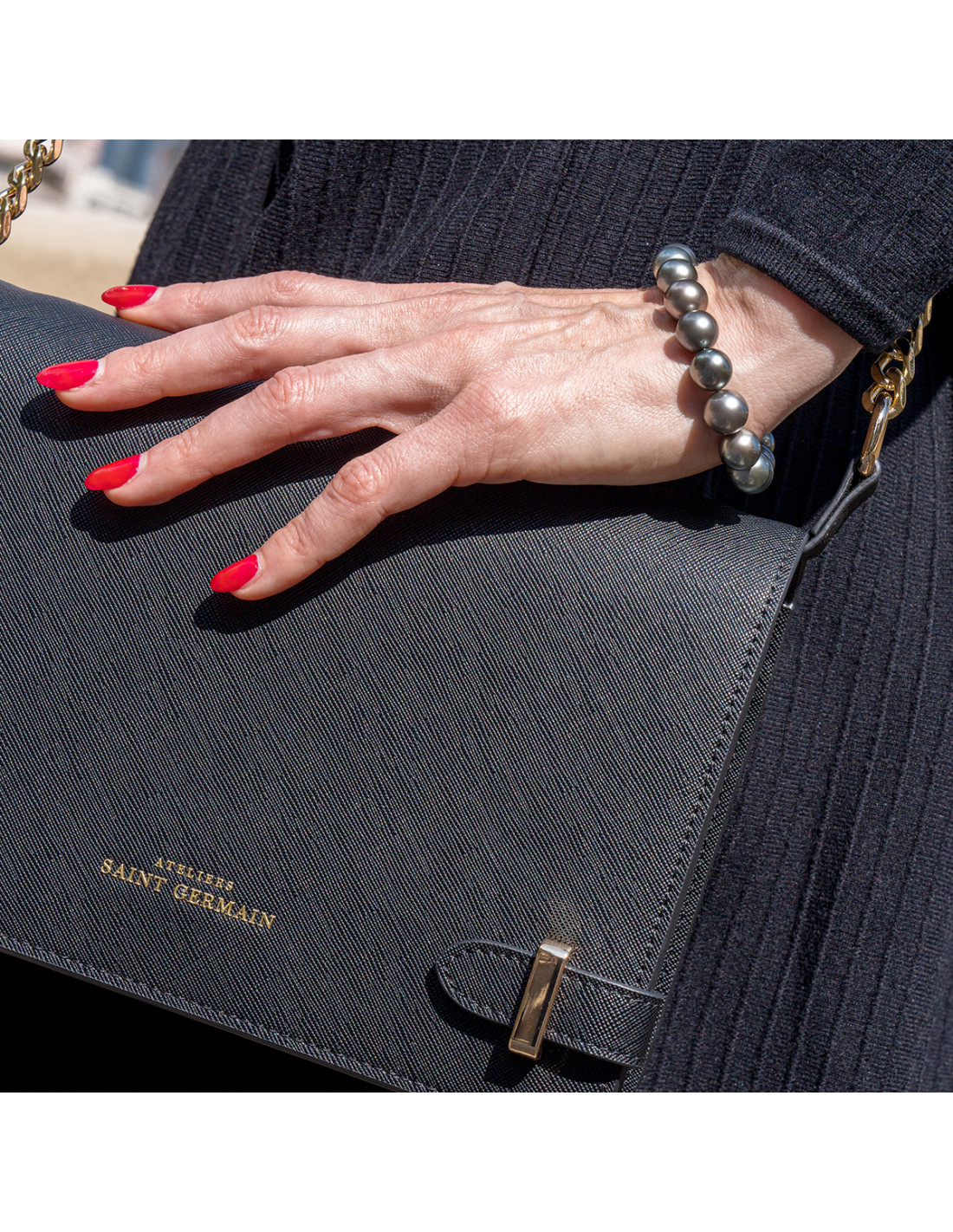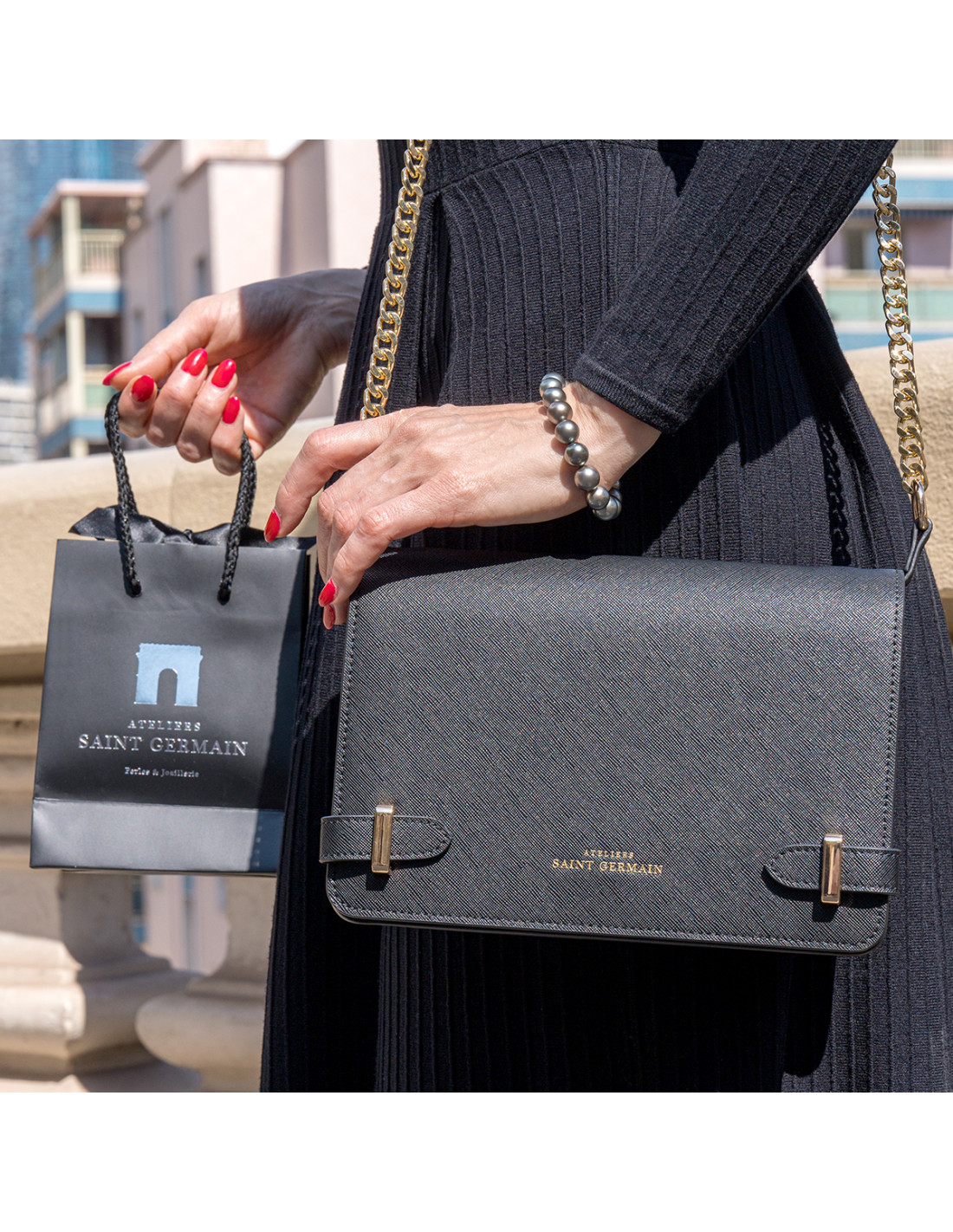 Sac ELYSEE Porté Épaule  - 2 Compartiments dont 1 Zippé - Pochette intérieure Zippée - Doublure intérieure suédine - Soufflets d'aisance - Bandoulière Chainage Doré ajustable  - Logo ATELIERS SAINT GERMAIN - Fermeture à Rabat avec Fermoir Aimanté - Finition Cuir Saffiano