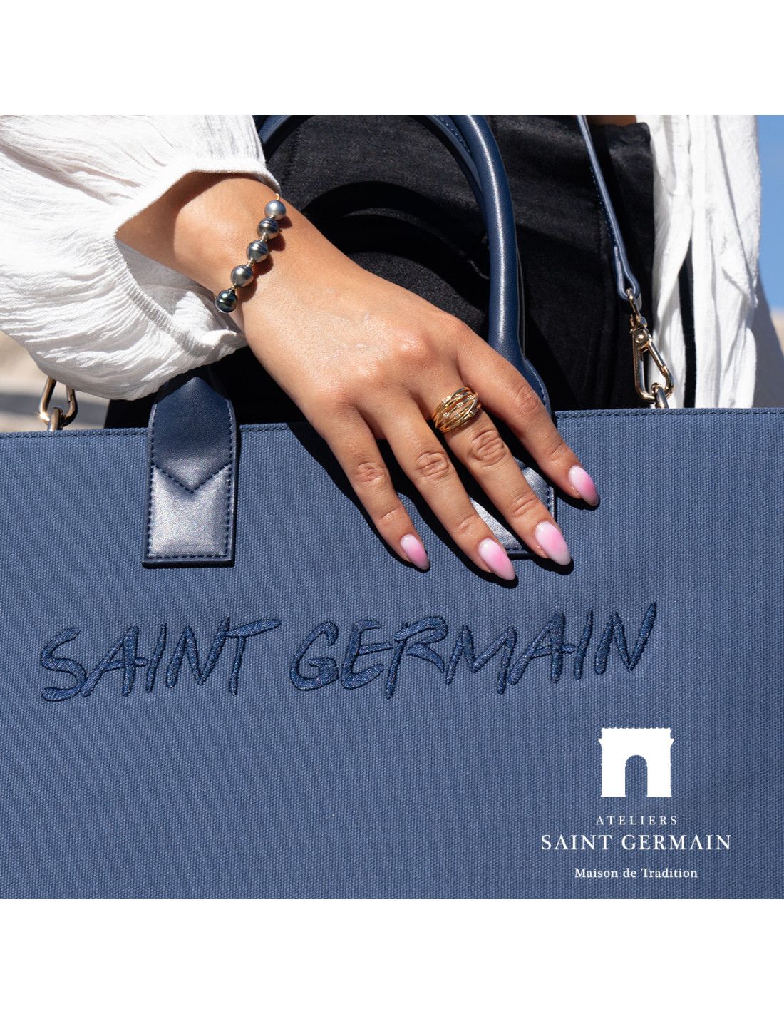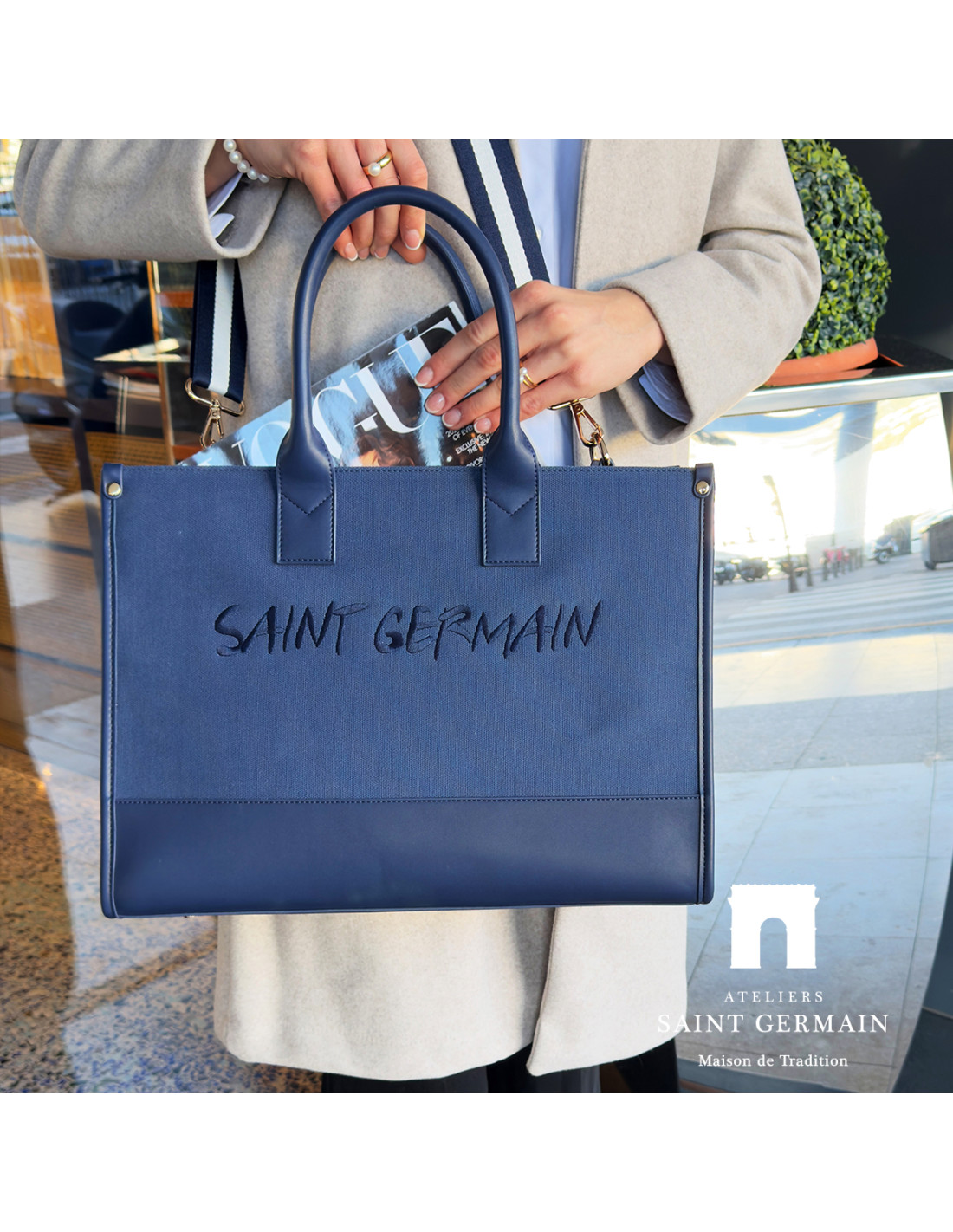 Ateliers Saint GermainSac Cabas Rectangulaire Emblématique SAINT GERMAIN - Large Compartiment Central - Pochette Zippée intérieure et 2 Pochettes coté - intérieur Suédine - Crochet intérieur de fermeture - Logoté ATELIERS SAINT GERMAIN - Finition Cuir Lisse et Tissu