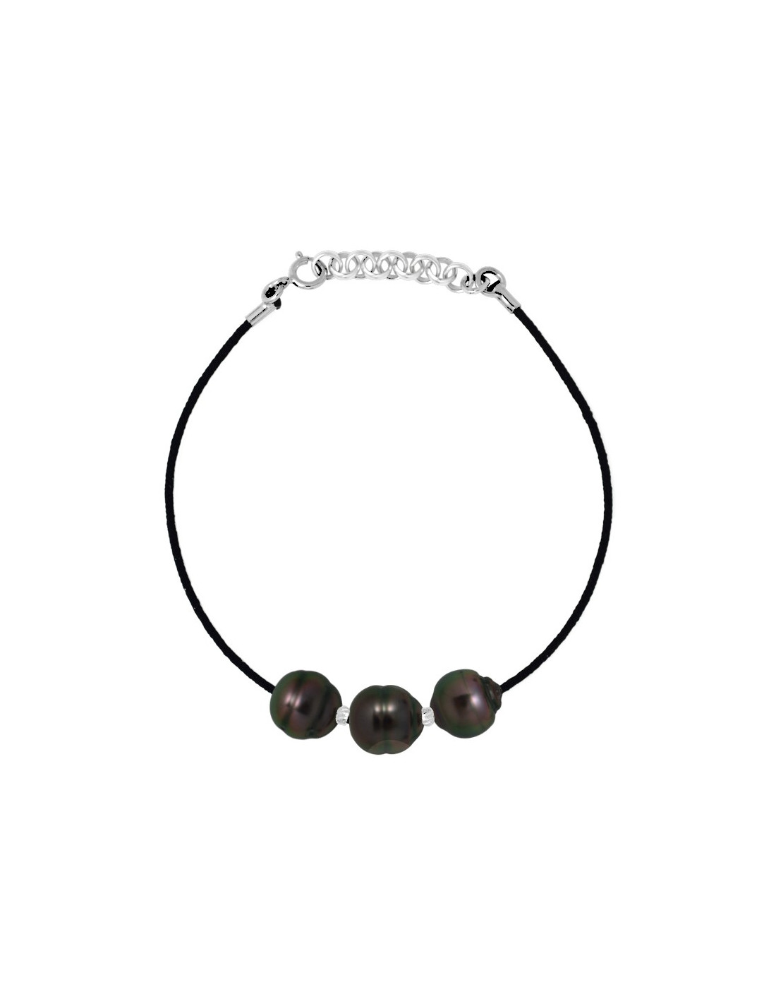 Black Cord Link Bracelet 3 Tahitian Beads Circled 9-10 mm - Silver 925 - Inaona